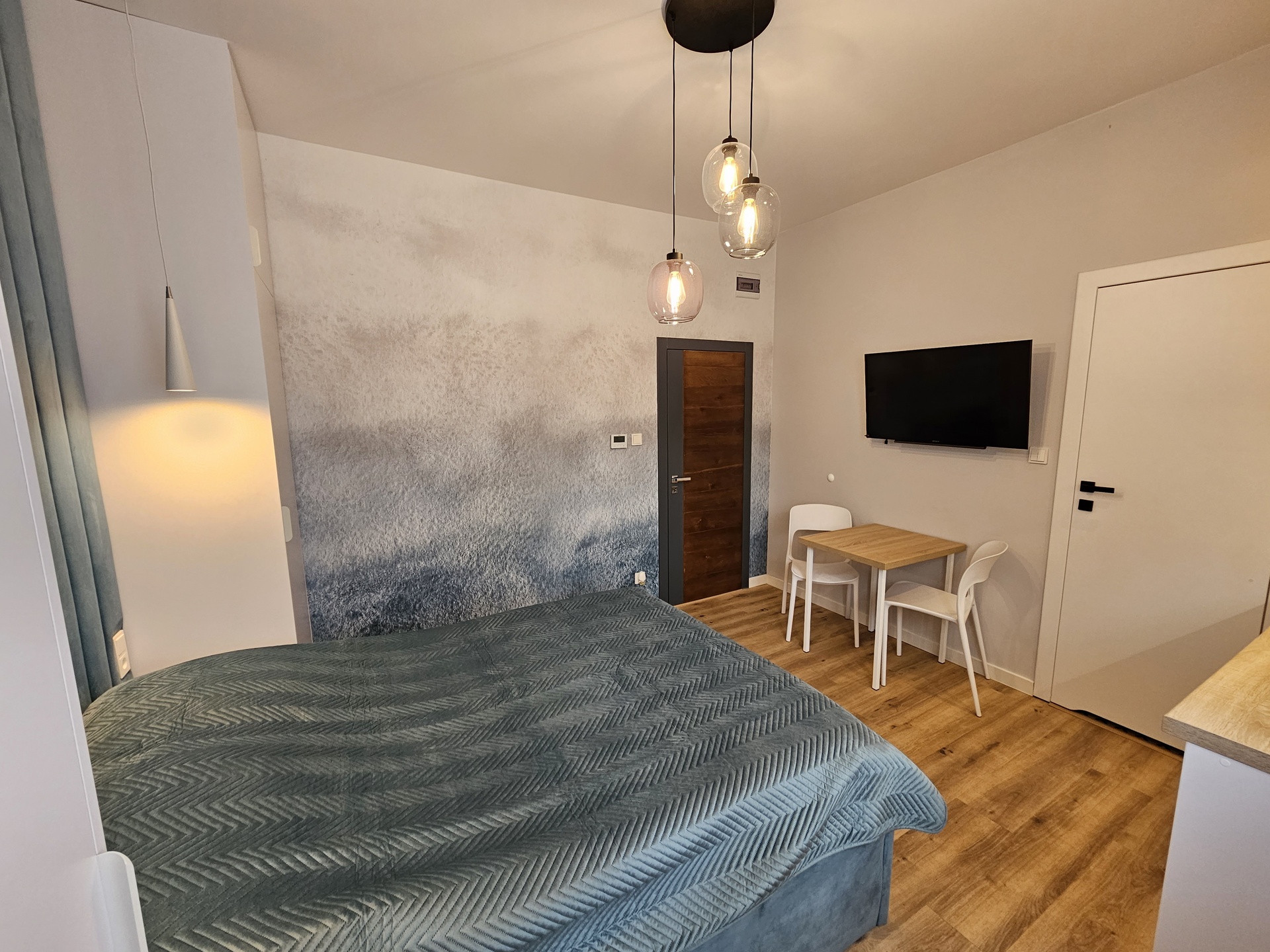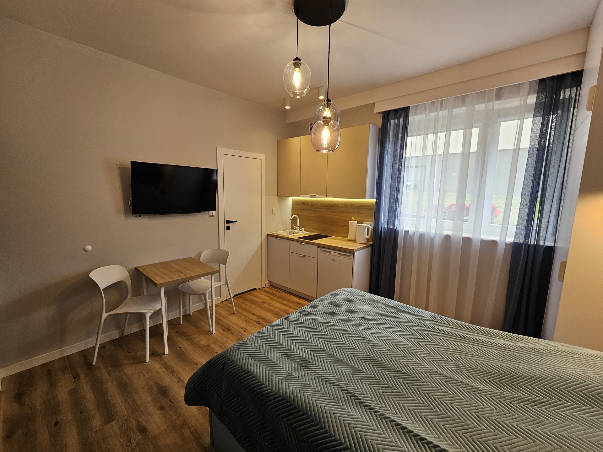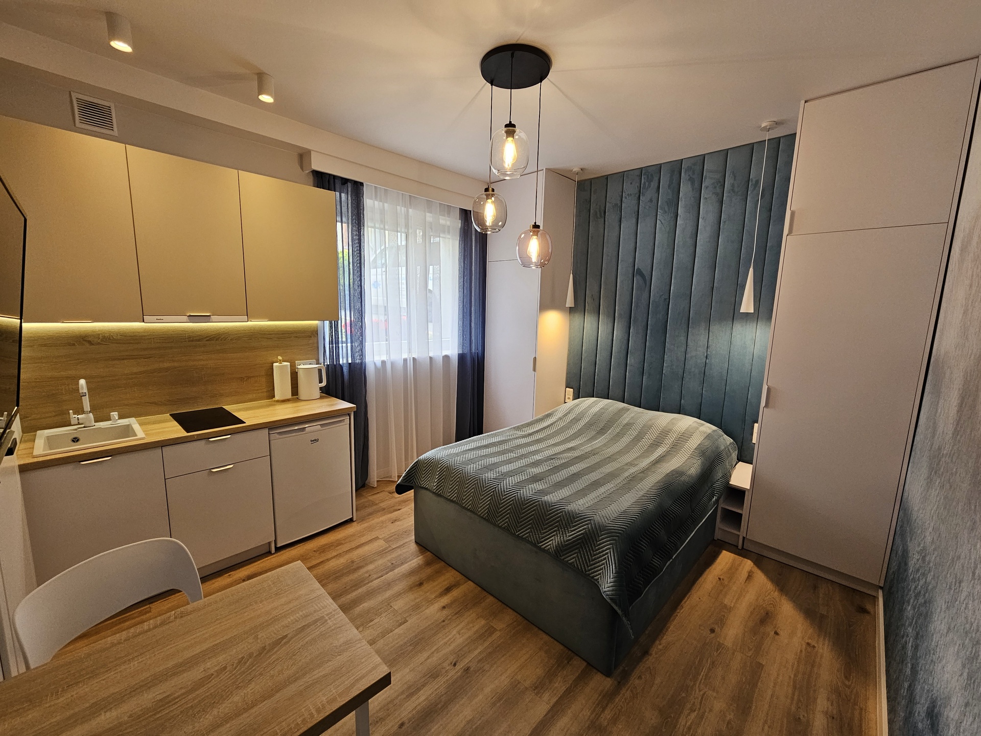 Apartament na niskim parterze w pięknej zabudowie z materiału, oraz pakownymi szafami. Apartament posiada podwyższony sufit i aneks kuchenny. Idealny dla par.